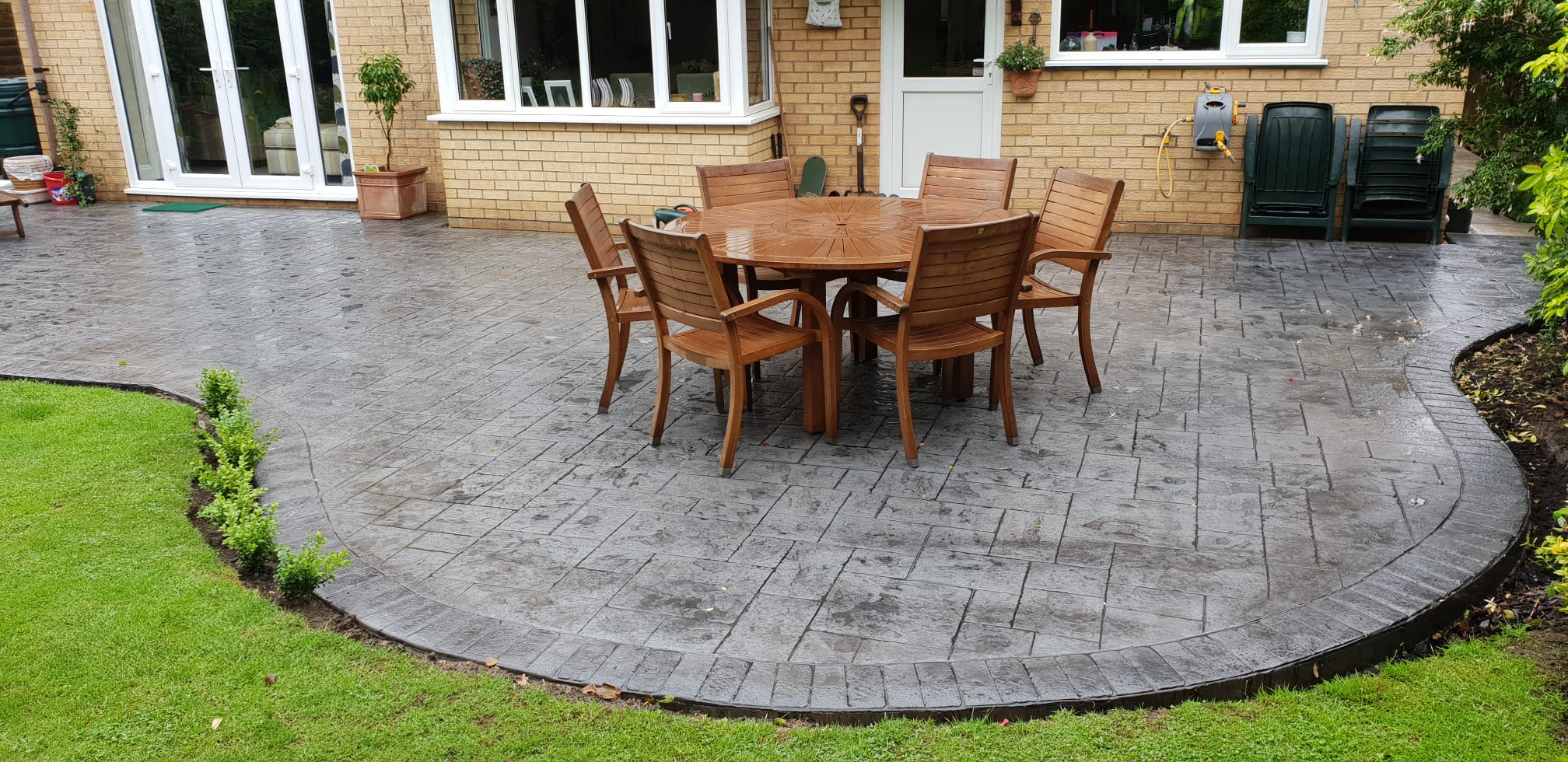A concrete printed driveway can be designed by us to compliment your outdoor landscape or you may want the concrete stamped to match the style of your house. The versatility of concrete is what makes a concrete patio such a great choice! A printed or stamped concrete patio can be moulded into any shape to fit your needs or creative ideas. One of the most attractive advantages to having a concrete patio is the wide range of choice.